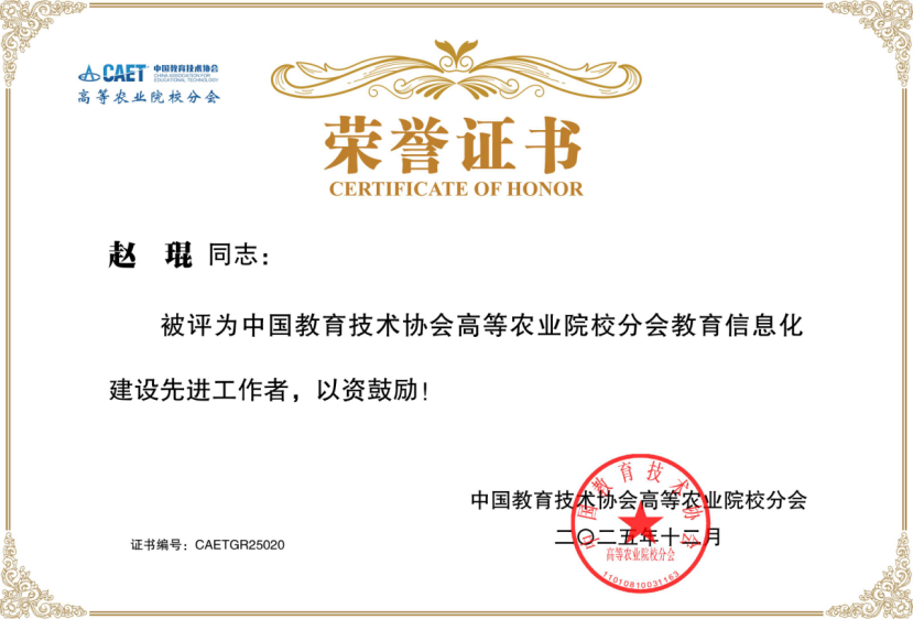 (通讯员 张纯)近日,在中国教育技术协会高等农业院校分会组织的2025年高等农业院校先进集体和先进工作者评选活动中,学校信息技术中心获评教育信息化建设先进集体;工程师赵琨获评教育信息化建设先进工作者。