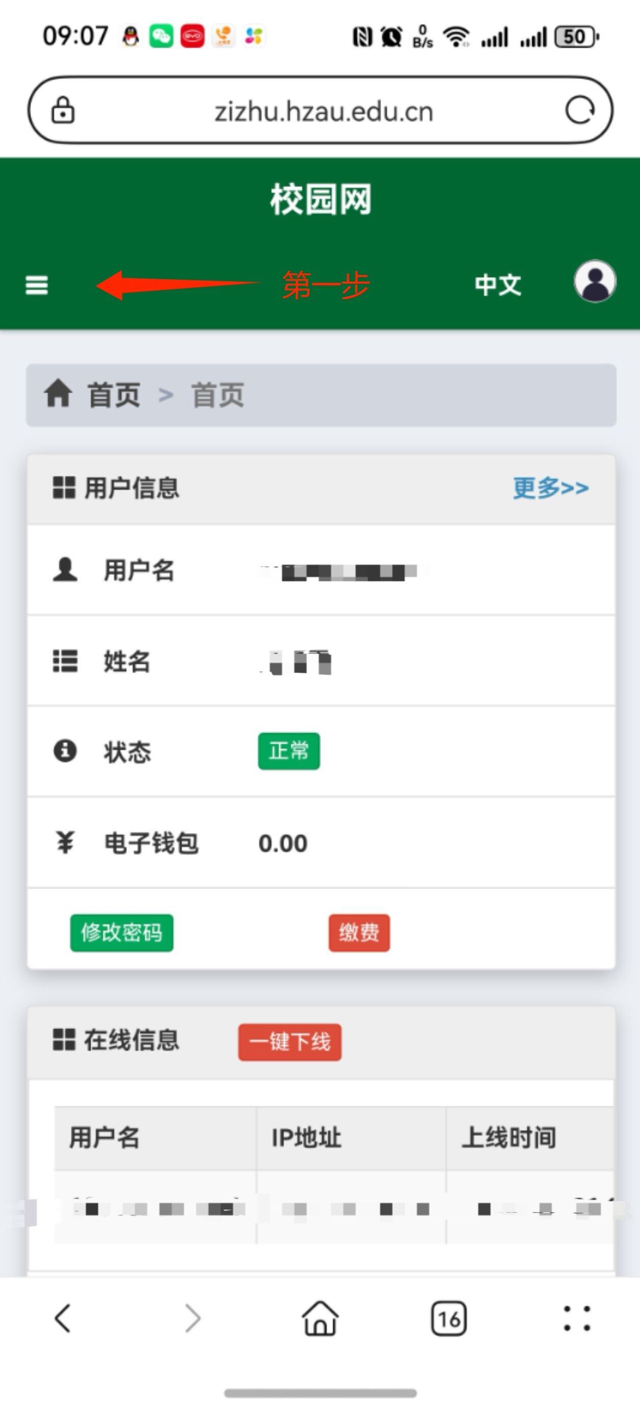 校园网自服务平台网址:http://zizhu.hzau.edu.cn,打开后输入校园网账号名与密码,可实现如下功能: